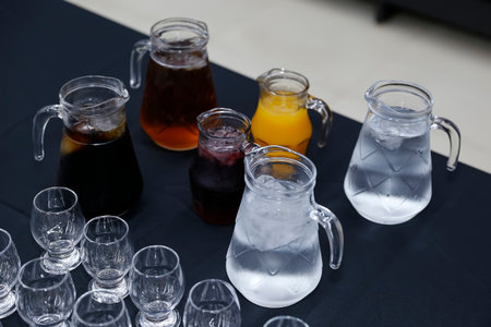 Transparent glass jars filled with fresh water, juices and refreshments beside tasting glasses. Perfect for hydration, bartender and gourmet event themes. clean background
