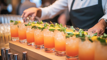 Bartender is lining up a series of cocktails decorated with mint and lemon for a party