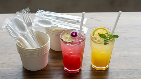 Summer drinks with straws and disposable tableware on a wooden table.