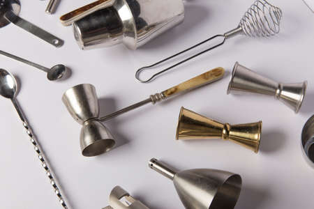 Flat lay composition with bartender iron tools, such as cocktail shaker, jigger, mixing glass, stirring spoon. Background is white.