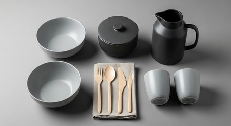Minimalist tableware set with bowls pitcher cups and utensils