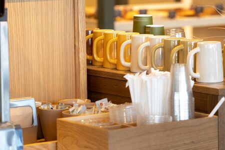 Drink station with coffee mugs lids straws sugar and condiments