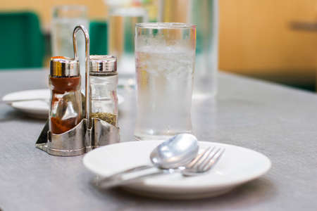 A cold glass of ice water complete, with plates, spoons, forks, and Sauce bottle, pepper bottle the dining table in a modern restaurant and light blurred in the restaurant background.