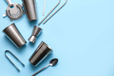 Modern bartender kit on blue background, closeup