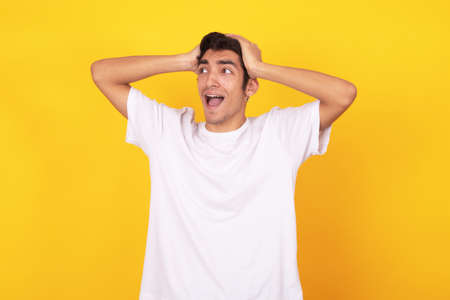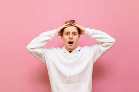 Shocked young man in casual clothes stands on a pink background holding his head, looks in camera with a surprised face. Handsome guy shocked. Copy space
