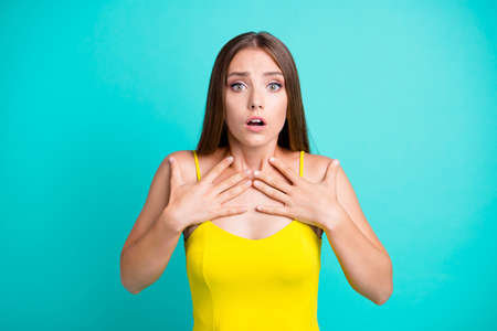 Young caucasian curly hair brunette 40 years old woman with blue eyes and nude make-up in the color shirt in the studio. Emotional shot with surprise emotion.