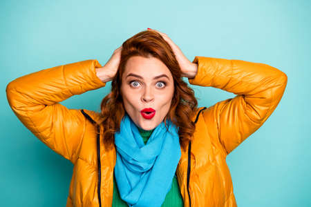 Closeup photo of funny lady addicted shopper look low black friday prices arms on head wear yellow overcoat blue scarf green turtleneck isolated teal color background