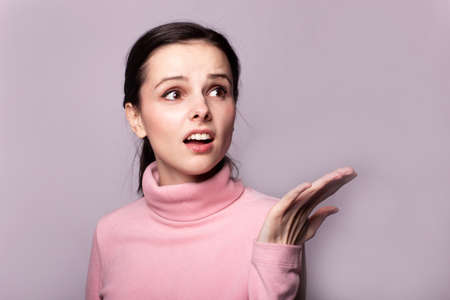 Young female feeling excited and shocked with great commercial offer, pointing to right side of photo, isolated on gray background. The girl points to the right to the advertising space.