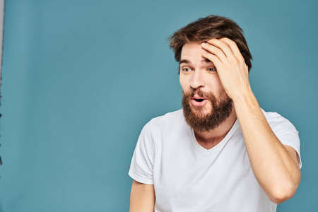 emotional man gesturing with hands lifestyle fun white t-shirt blue isolated stock