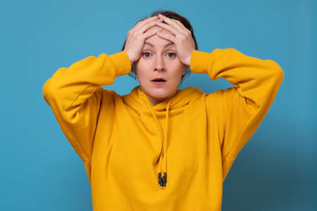 Portrait of unhappy young woman holding her head with hands. Close up of sad female in yellow hoodie clutching head from headache