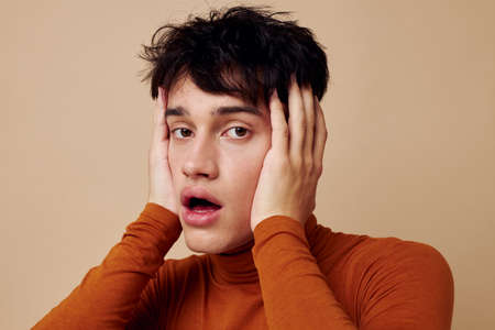 portrait of a young man stylish hairstyle brown turtleneck isolated background unaltered