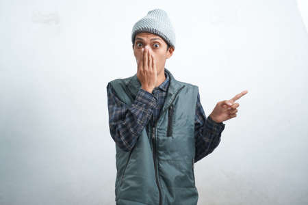 Young good looking Asian chinese malay man pose face body expression mode emotion on white background moth open shout surprised hand