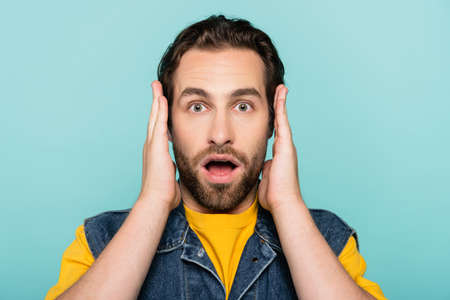 omg unbelievable shock amazement. astounded man with open mouth. portrait of a young bearded guy on blue background. emotion facial expression and reaction concept.