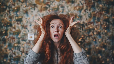 Emotional young woman with ginger hair and freckles closing eyes tight and screaming in excitement and full disbelief keeping hands on her head Positive human emotions fe : Generative AI