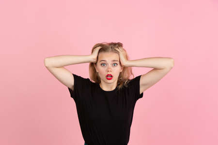 Crazy shocked. Portrait of young emotional woman gesturing isolated on pink studio background. Human emotions, facial expression, sales, ad concept. Blonde caucasian pretty model gesturing. Copyspace.