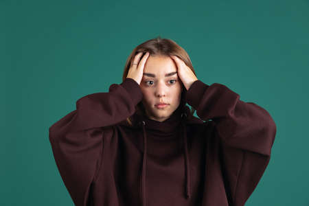 Half-length portrait of young beuatiful girl, student in brown hoodie has a headache isolated on green vintage studio backgroud.
