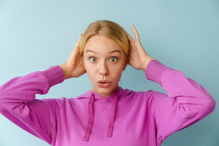 Portrait of beautiful caucasian girl posing isolated over blue background. Shocked