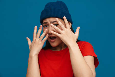 Shocked scared young asian woman in casual clothes standing over blue wall background, covers face with hands
