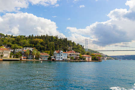 Sunny landscape with bright houses over the water edge of the Bosphorus Strait in Istanbul, Turkey