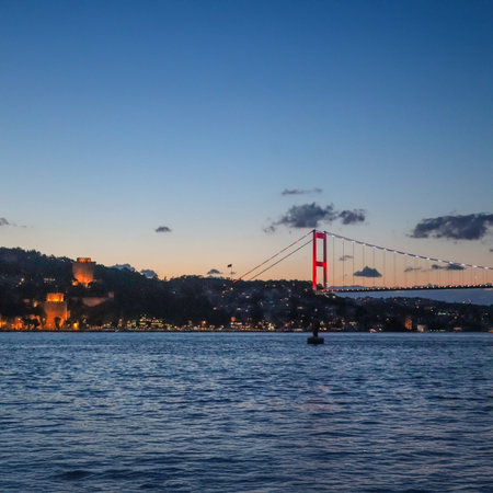 A stunning Istanbul sunrise featuring the Bosphorus, illuminated bridge, and historic Rumeli Fortress, blending natural beauty with architectural marvels.