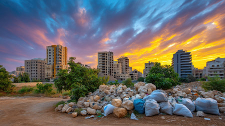 A stunning sunset illuminates the skyline of a developing urban area, showcasing a mix of nature and debris. The vibrant clouds contrast with the buildings.