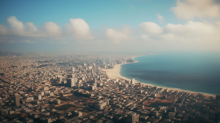 Aerial view of the beach and city in the morning light.