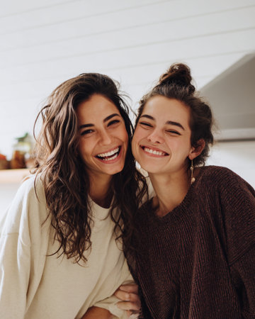 Two young women, one with straight black hair and the other with curly brown hair, smile brightly as they take a selfie together. Their expressions radiate happiness and friendship, capturing a cozy indoor atmosphere filled with warmth and connection.