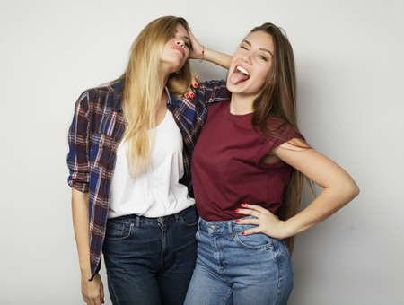 Two young girl friends standing together and having fun. Looking at camera.