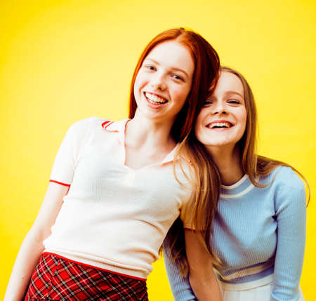 lifestyle people concept: two pretty young school teenage girls having fun happy smiling on yellow background