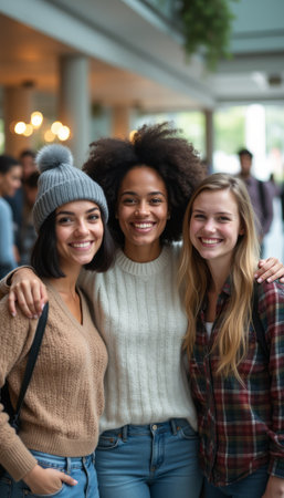 Three diverse women smiling together in a cozy indoor setting