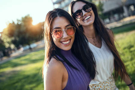 beautiful and young girls having fun and walking around the city happy and smiling on a sunny day