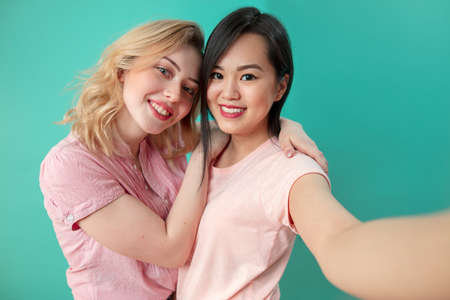 Two diverse young women ethnic friends in summer clothes, embracing each other while making selfie at blue studio background