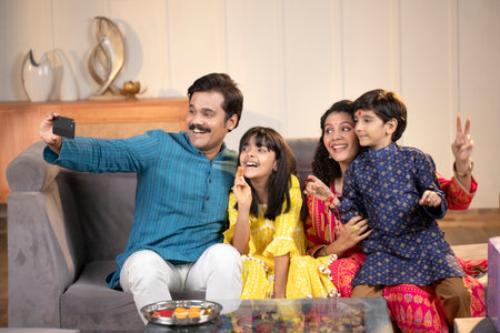 indian family taking selfie with mobile phone in living room at home