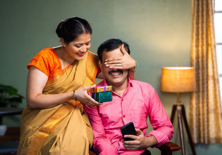 Happy indian woman giving gift to husband at home - concept of wedding anniversary, togetherness and affection