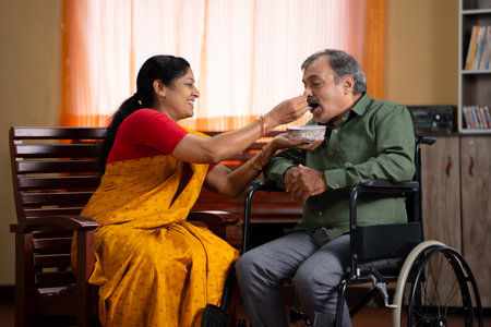 happy caring wife feeding her husband with disability on wheelchair at home - concept of health recovery, family assistance and relationship compassion