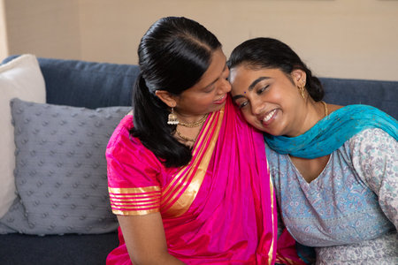 Indian mother and daughter wearing saree and kurta sharing moment while sitting on dark blue sofa. Family, tradition, intimacy, cultural, heritage, tenderness, elegance