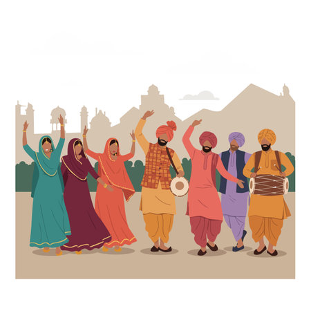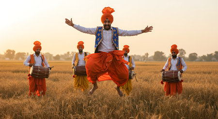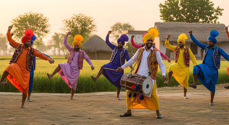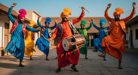 A group of six people performs traditional Punjabi Bhangra dance wearing colorful clothes with musical instruments, celebrating culture in a lively mood.