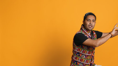 Ecstatic person wearing traditional indian attire doing energetic dance steps. Lively talented man doing entertaining bollywood choreography moves, studio background, camera A
