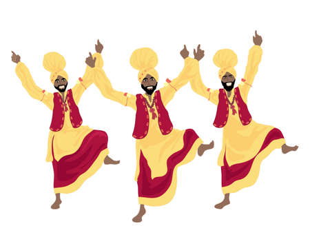 an illustration of three punjabi men performing a bhangra dance in colorful red and yellow traditional dress on a white background