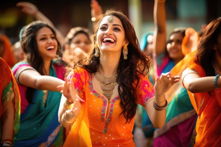 A lively and energetic group of women dancing joyously in the middle of a vibrant street, Indian women dancing on the streets in traditional dresses, AI Generated