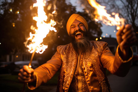 A cheerful man dressed in traditional attire enjoys a vibrant celebration at night. Bright sparklers light up a lively street filled with joyous people and festive decorations.
