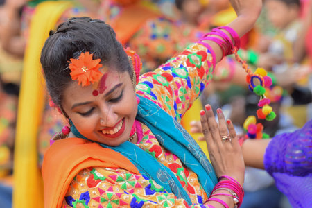KOLKATA , INDIA - MARCH 12, 2017: Young girl dancers joyful dance at Holi/Spring festival,known as Dol (in Bengali) or Holi (in Hindi) celebrating arrival of Spring in India. Popular Indian festival.