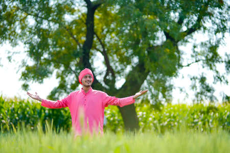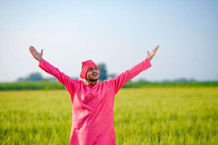 Young indian farmer standing his wheat field and giving happy expression