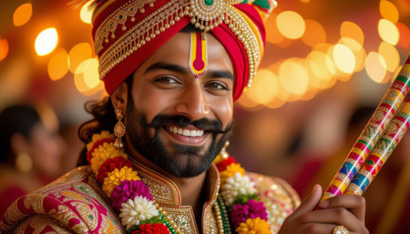 Man dances and Celebrates the navratri festival. Male holds Dandiya sticks in his hands