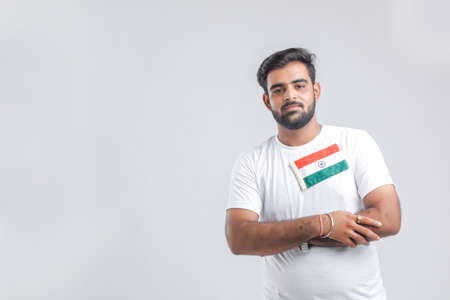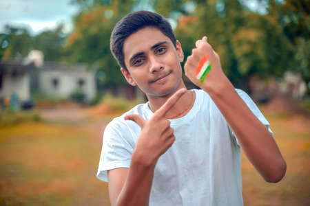 An enthusiastic Indian boy with his face vibrantly painted in the colors of the Indian flag smiles broadly, celebrating national pride and unity