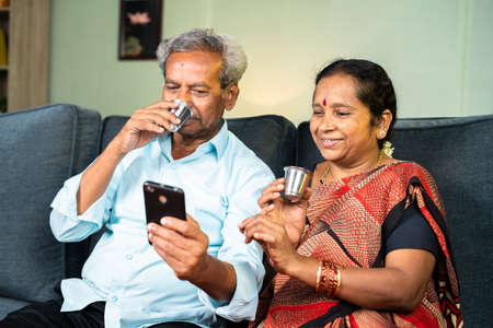 smiling senior couple using mobile phone while have tea at home on sofa - concept of relaxation