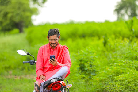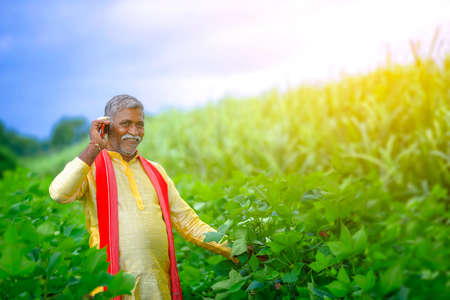 Young indian agronomist or banker showing smart phone with farmer at cotton field
