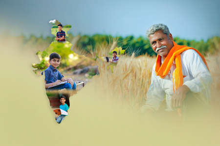 A young Indian farmer, wearing a straw hat, smiles proudly at the local market, surrounded by fresh vegetables and Indian flags.