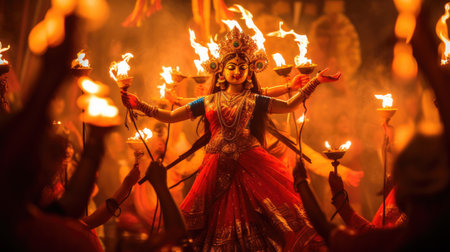 Divine celebration: Navratri, the nine nights dedicated to goddess durga with vibrant rituals, fasting, and traditional dances, the triumph of good over evil and the power of feminine energy.