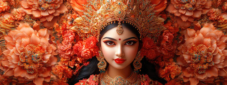 Intricate goddess statue adorned with colorful floral garland in traditional indian style